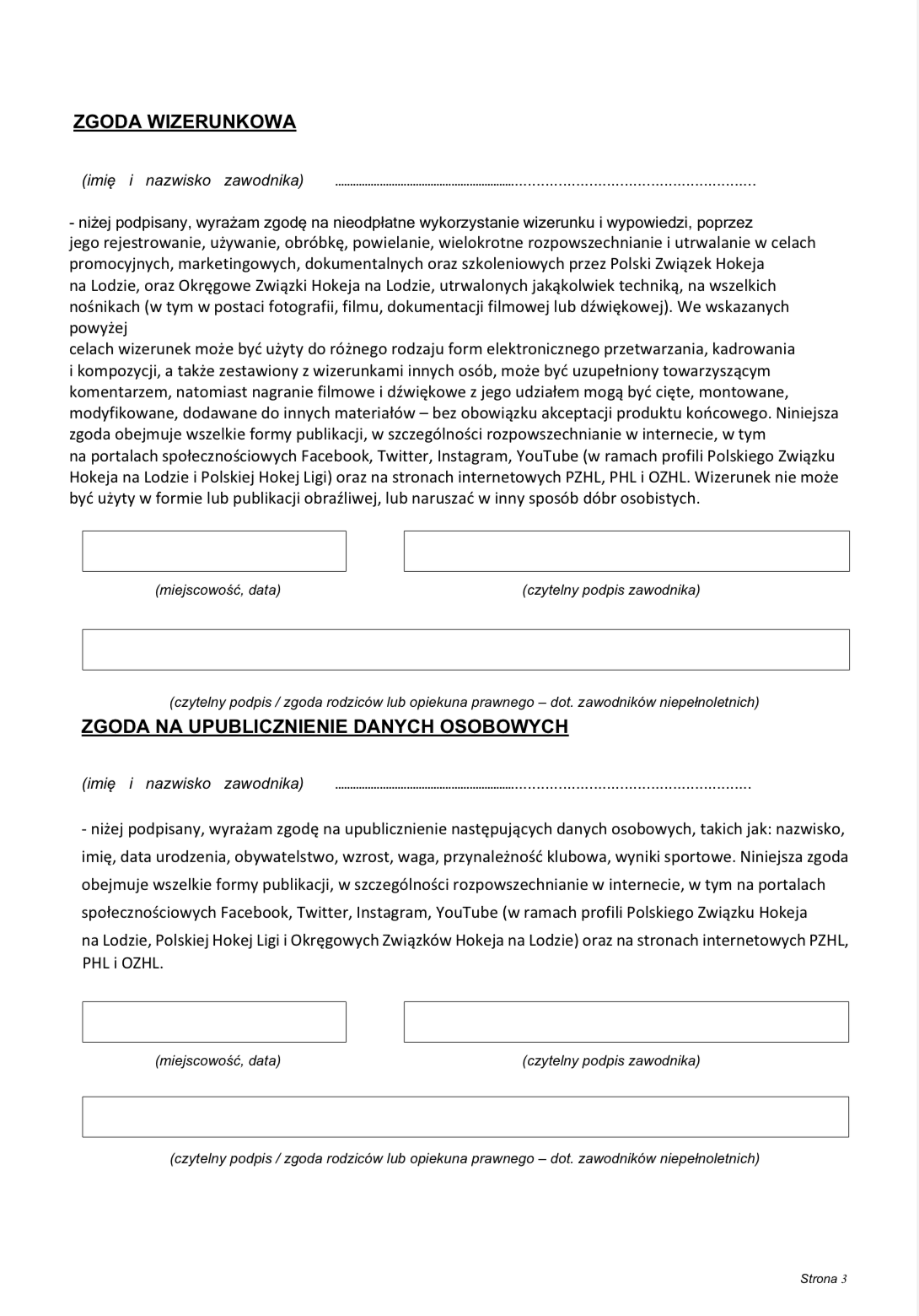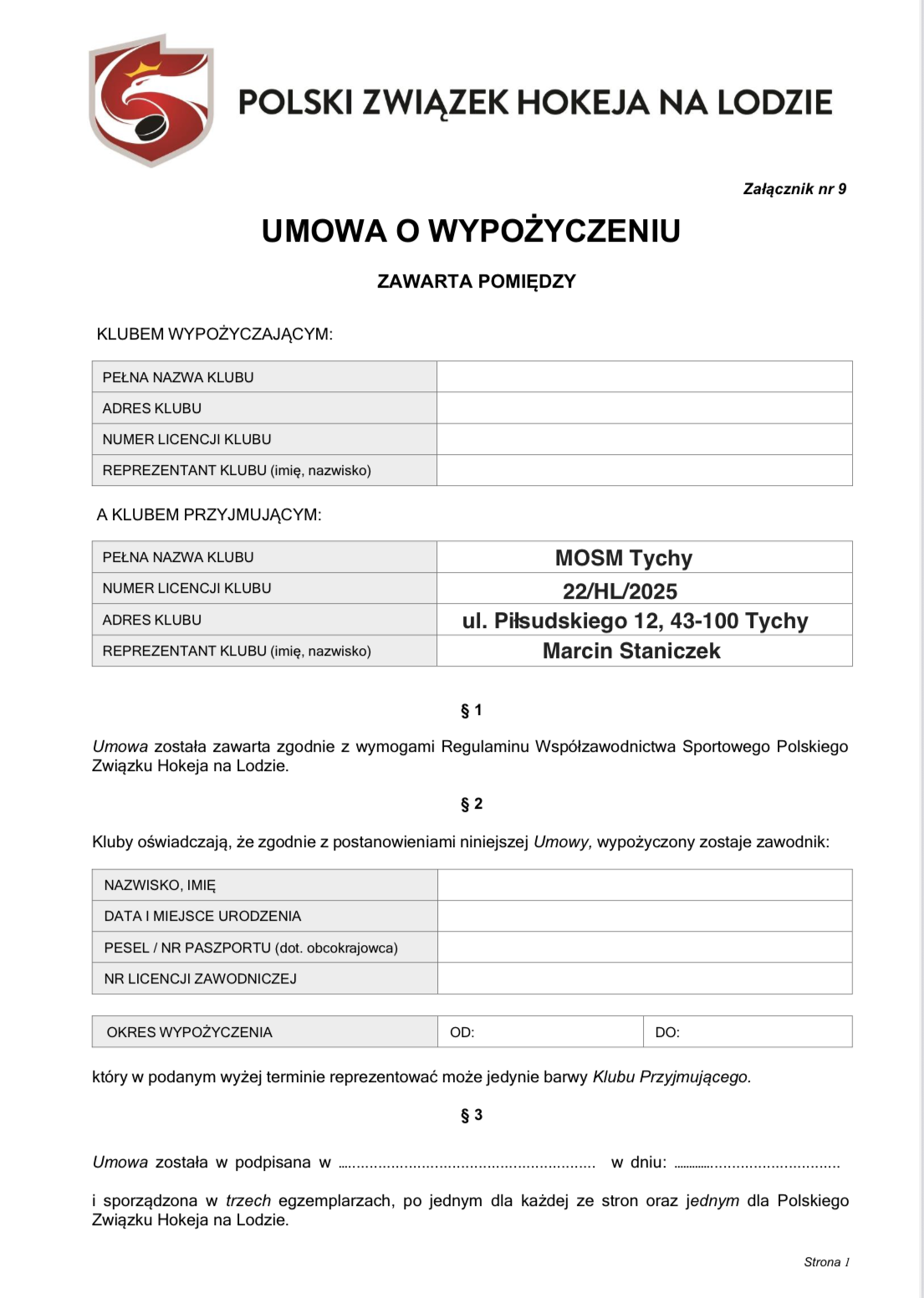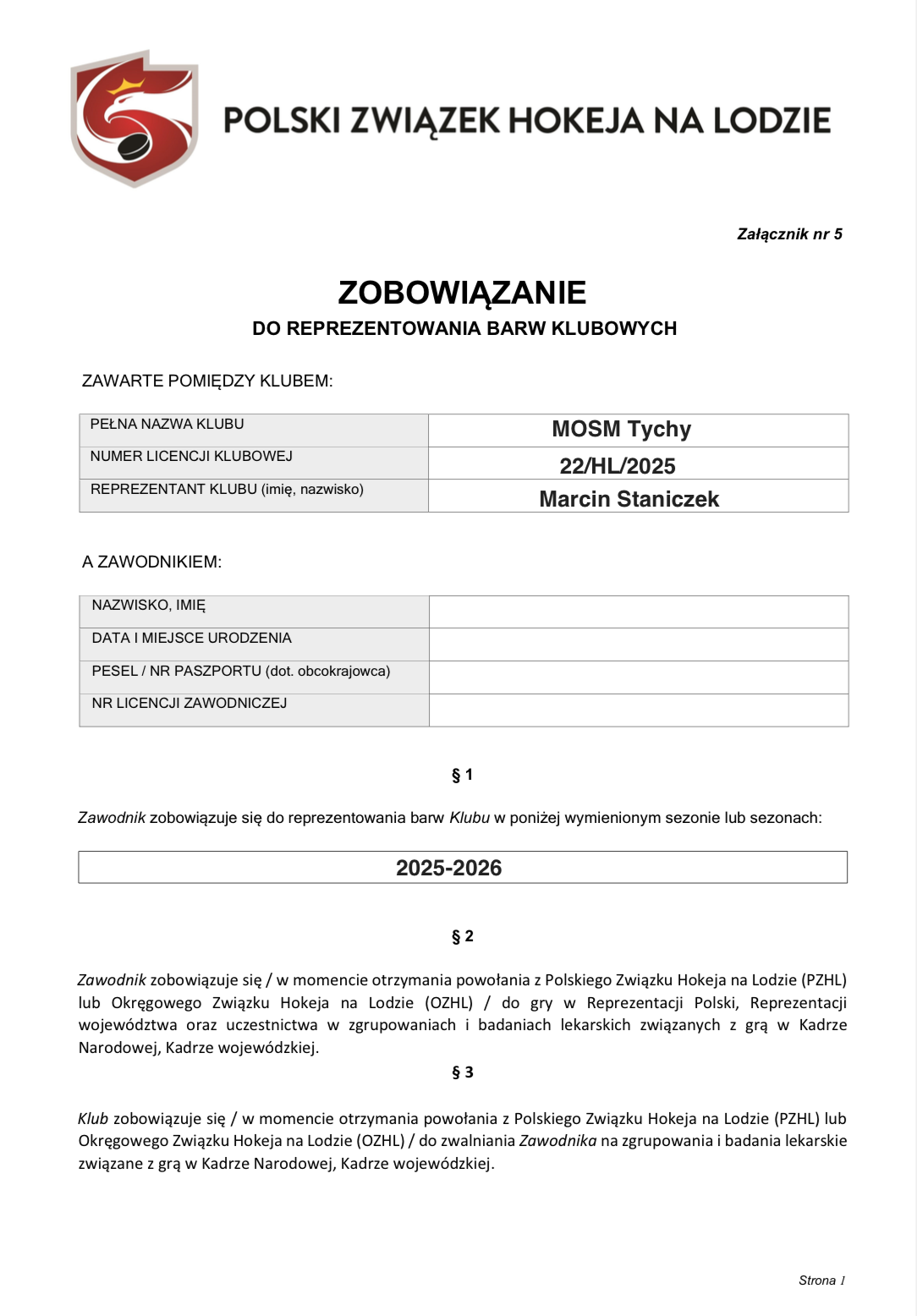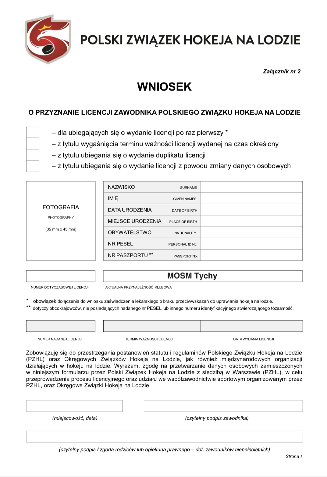 Dokumenty do pobrania dla członków Stowarzyszenia Tyskie Lwy oraz zawodników MOSM Tychy uzupełniające do PZHL.